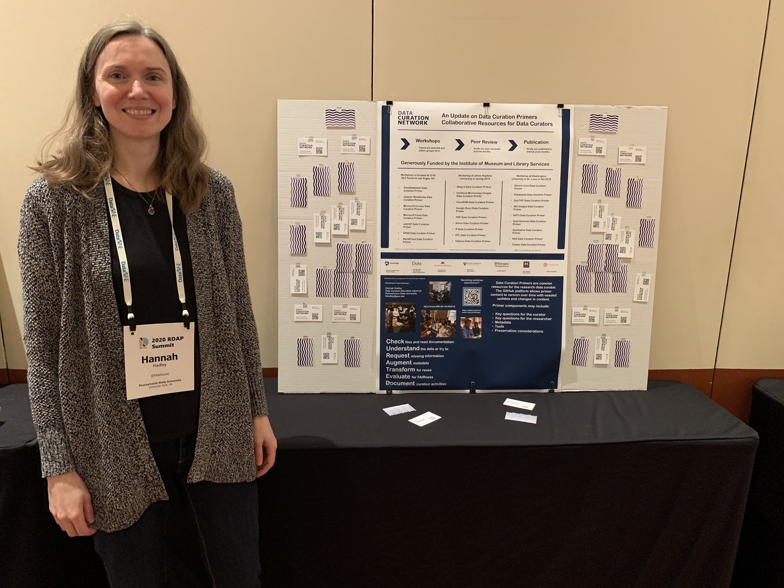 Many DCN members in attendance were also presenting their research and work through posters, lightning talks, panels, and workshops. The DCN project was represented by two posters this year: one from the University of Minnesota offering a perspective on how the DCN facilitates connections, and one from Pennsylvania State University sharing an update on the primers developed in the specialized data curation workshops.  Additionally, Wendy Kozlowski of Cornell University presented a poster discussing methods for making data more accessible through techniques involving metadata, and Jen Darragh of Duke University presented a poster that reported on a collaboration with faculty from three academic disciplines to promote data sharing.